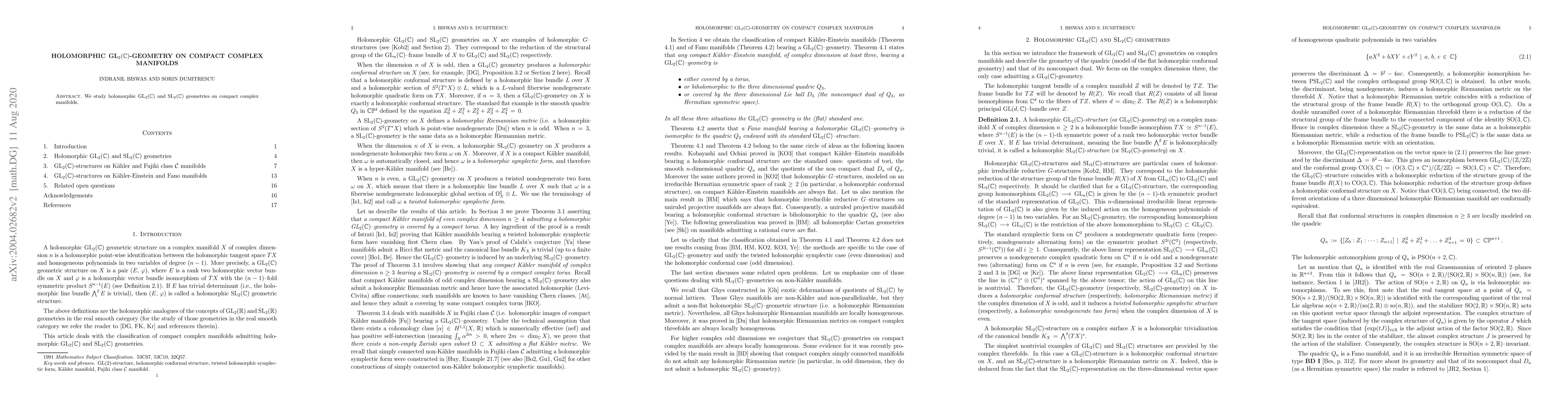 This paper explores holomorphic GL(2) and SL(2) geometries on compact complex manifolds, demonstrating that higher-dimensional Kähler manifolds with such geometries are covered by complex tori. It classifies Kähler-Einstein and Fano manifolds with these geometries, finding that only specific examples, including certain tori and three-dimensional quadrics, exhibit holomorphic GL(2)-geometry.