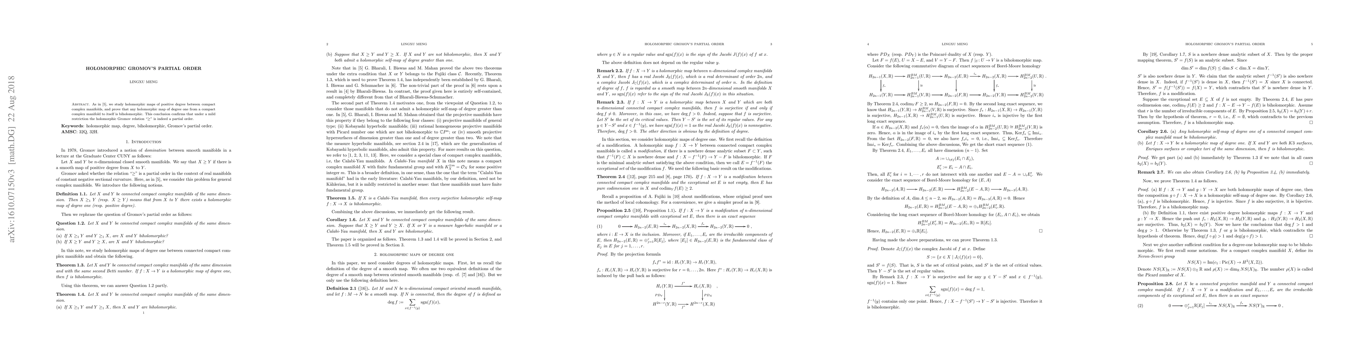 As in [5], we study holomorphic maps of positive degree between compact complex manifolds, and prove that any holomorphic map of degree one from a compact complex manifold to itself is biholomorphic. This conclusion confirms that under a mild restriction the holomorphic Gromov relation ">_" is indeed a partial order.