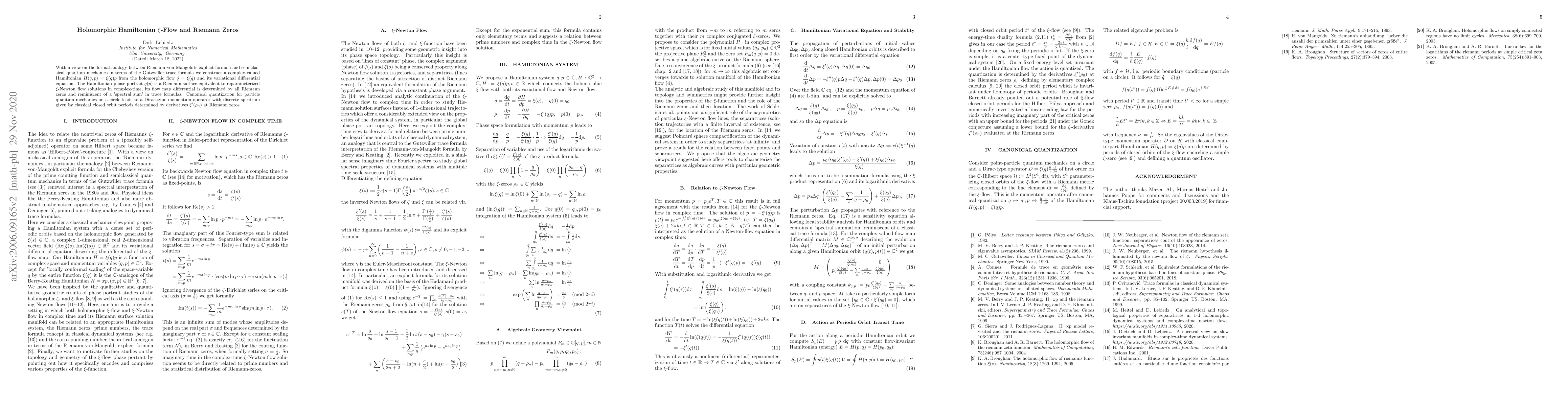 With a view on the formal analogy between Riemann-von-Mangoldts explicit formula and semiclassical quantum mechanics in terms of the Gutzwiller trace formula we construct a complex-valued Hamiltonian $H(q,p)=\xi(q)p$ from the holomorphic flow $\dot{q}=\xi(q)$ and its variational differential equation. The Hamiltonian phase portrait $q(p)$ is a Riemann surface equivalent to reparameterized $\xi$-Newton flow solutions in complex-time, its flow map differential is determined by all Riemann zeros and reminiscent of a 'spectral sum' in trace formulas. Canonical quantization for particle quantum mechanics on a circle leads to a Dirac-type momentum operator with discrete spectrum given by classical closed orbit periods determined by derivatives $\xi'(\rho_n)$ at Riemann zeros.