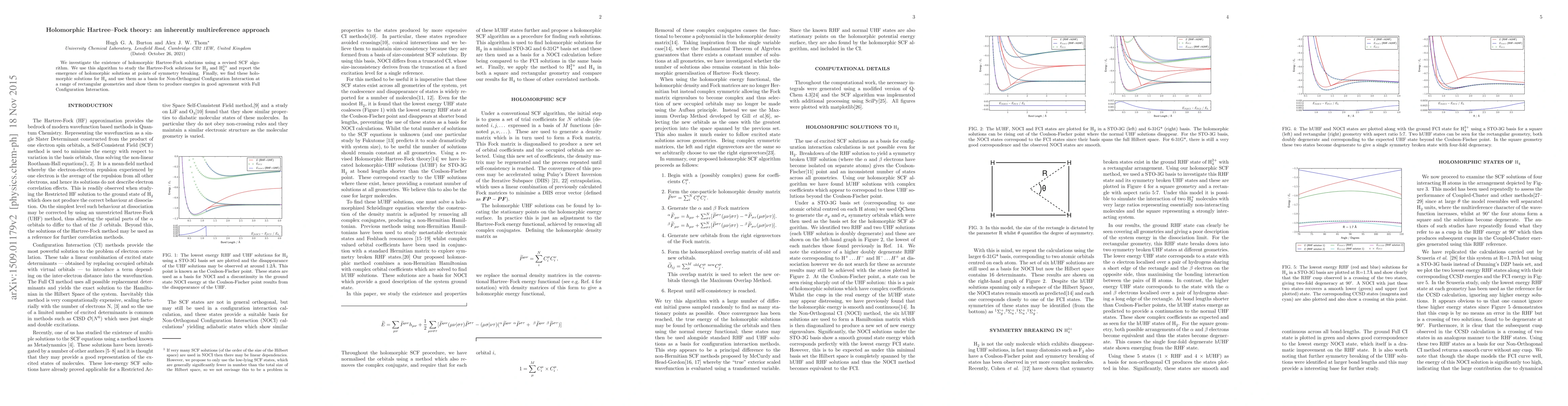 We investigate the existence of holomorphic Hartree-Fock solutions using a revised SCF algorithm. We use this algorithm to study the Hartree-Fock solutions for H$_{2}$ and H$_{4}^{2+}$ and report the emergence of holomorphic solutions at points of symmetry breaking. Finally, we find these holomorphic solutions for H$_{4}$ and use them as a basis for Non-Orthogonal Configuration Interaction at a range of rectangular geometries and show them to produce energies in good agreement with Full Configuration Interaction.