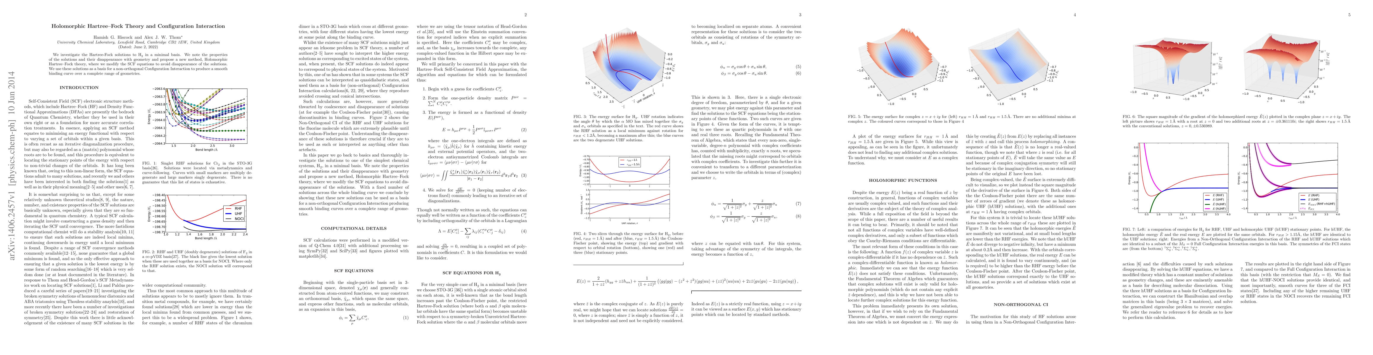 This paper explores Hartree-Fock solutions for H2 in a minimal basis, noting their disappearance with geometry, and introduces Holomorphic Hartree-Fock theory to maintain these solutions. The proposed method supports a non-orthogonal Configuration Interaction approach for a smooth binding curve across all geometries.