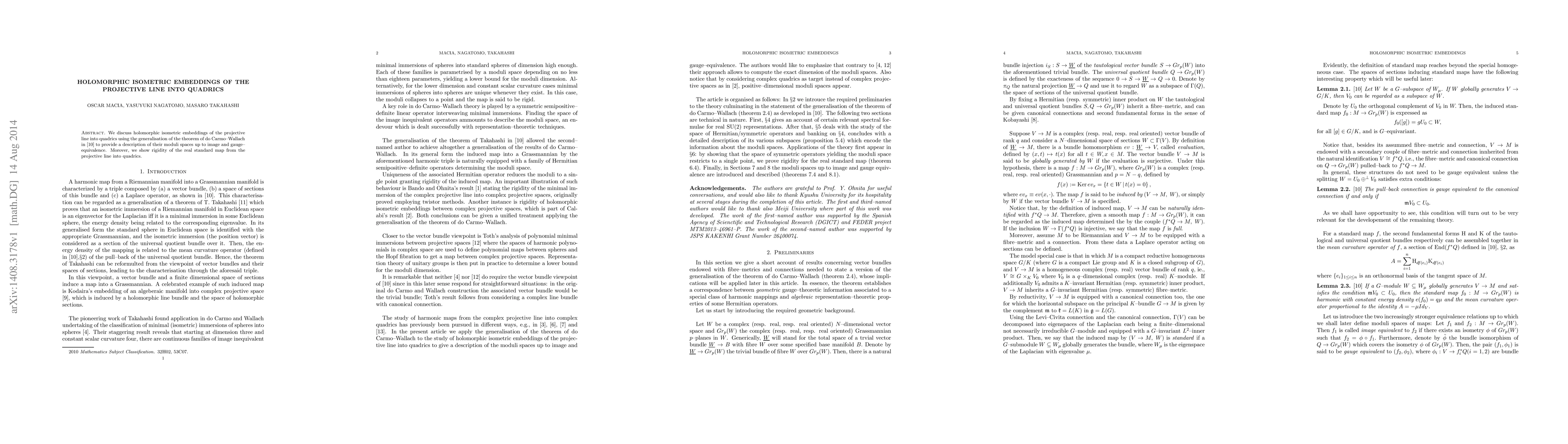 We discuss holomorphic isometric embeddings of the projective line into quadrics using a generalisation of the theorem of do Carmo--Wallach to provide a description of their moduli spaces up to image and gauge--equivalence. Moreover, we show rigidity of the real standard map from the projective line into quadrics.