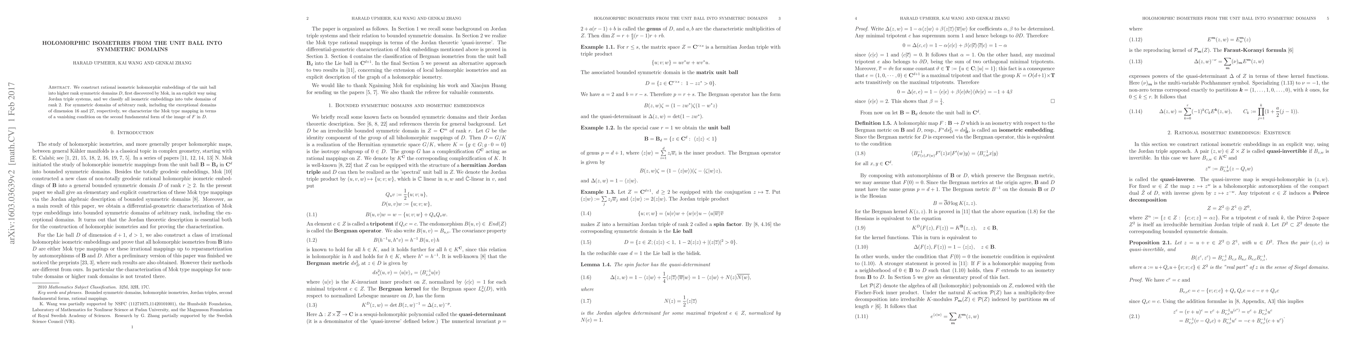 This paper constructs explicit isometric holomorphic embeddings of the unit ball into higher rank symmetric domains using Jordan triple systems and proves the uniqueness of these embeddings for all domains, including exceptional cases of dimensions 16 and 27.