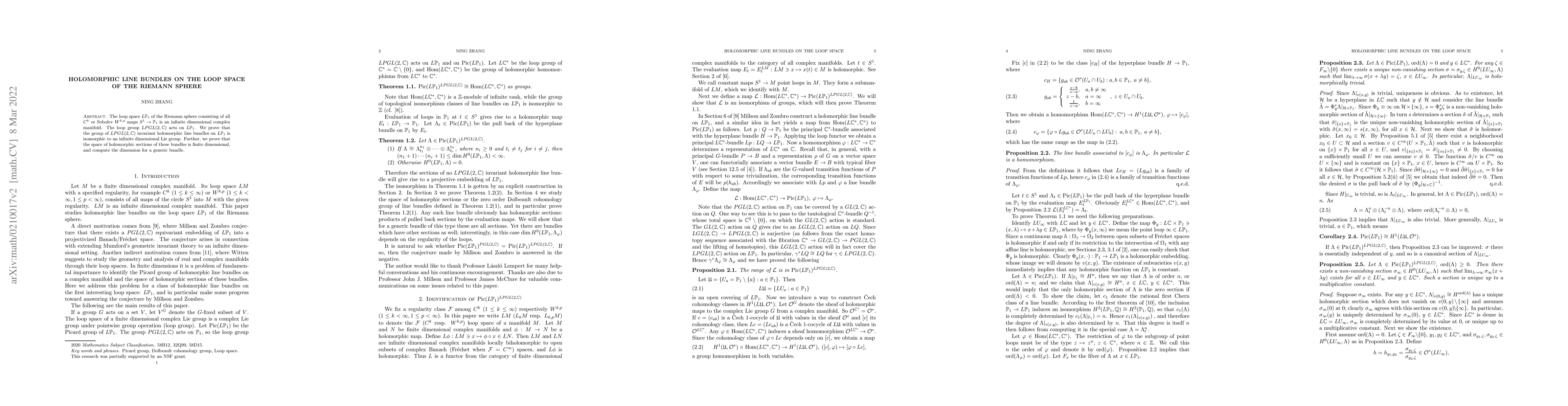 This paper explores holomorphic line bundles on the loop space of the Riemann sphere, finding a connection to an infinite-dimensional Lie group and computing the dimensionality of sections for generic bundles.