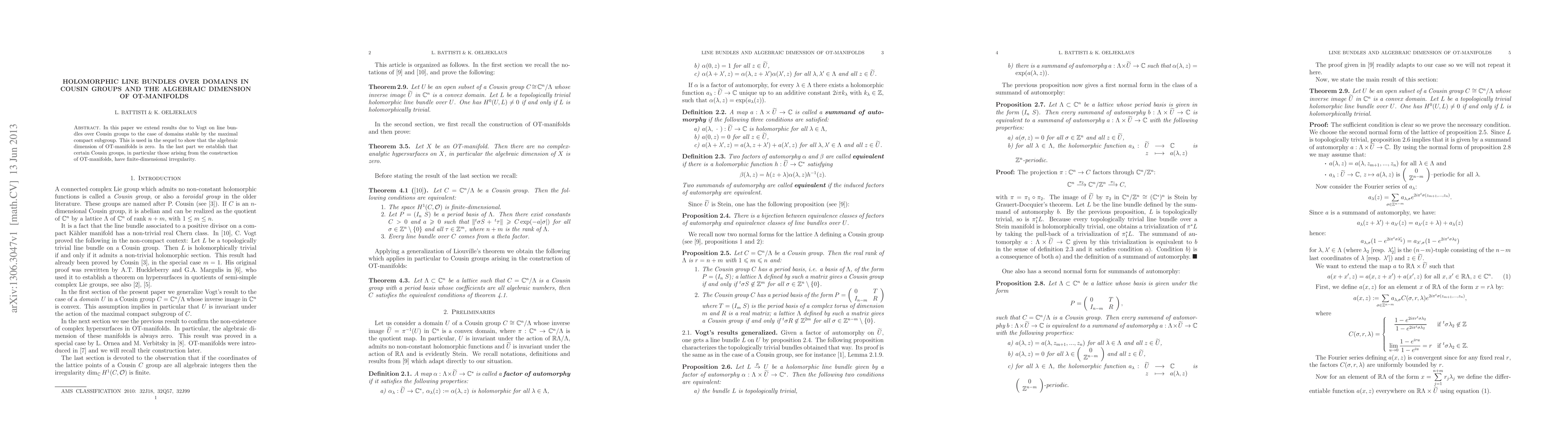 This paper extends Vogt's findings on holomorphic line bundles over Cousin groups to domains invariant under the maximal compact subgroup, demonstrating that the algebraic dimension of OT-manifolds is zero. It also proves that certain Cousin groups, especially those linked to OT-manifolds, possess finite-dimensional irregularity.