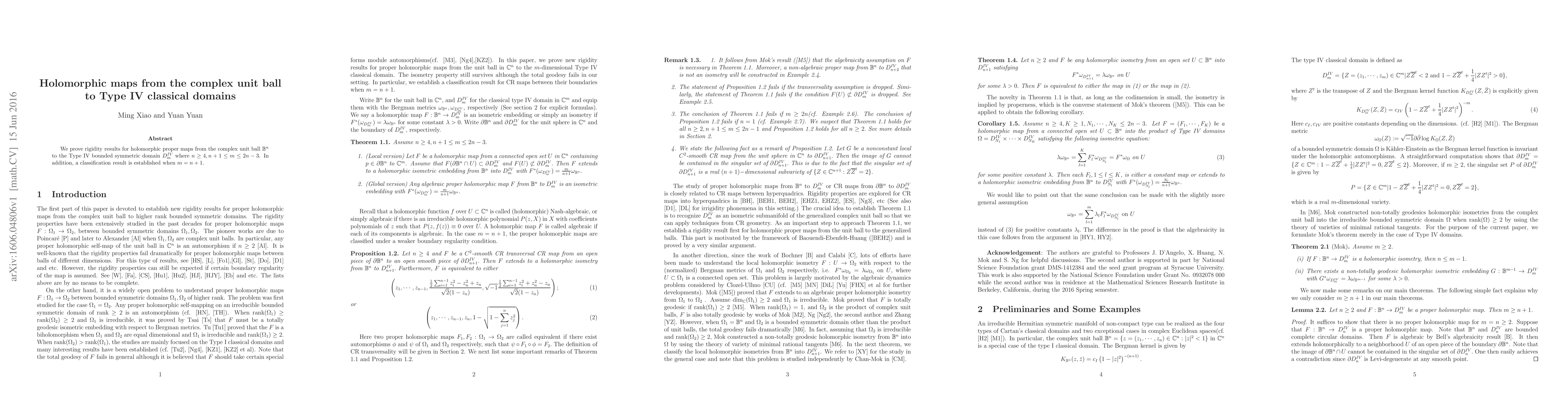 We prove rigidity results for holomorphic proper maps from the complex unit ball $\mathbb{B}^n$ to the Type IV bounded symmetric domain $D^{IV}_m$ where $n \geq 4, n+1\leq m \leq 2n-3$. In addition, a classification result is established when $m=n+1.$