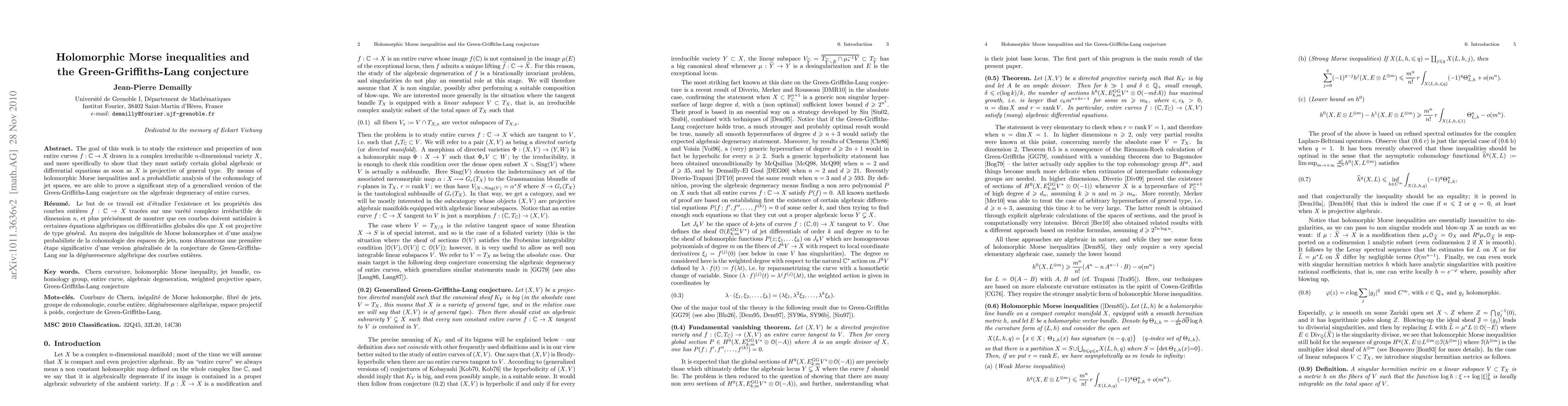 This paper investigates the existence of non-constant entire curves in projective complex varieties of general type, proving they satisfy global algebraic or differential equations. It utilizes holomorphic Morse inequalities and cohomology analysis to make progress on the Green-Griffiths-Lang conjecture.