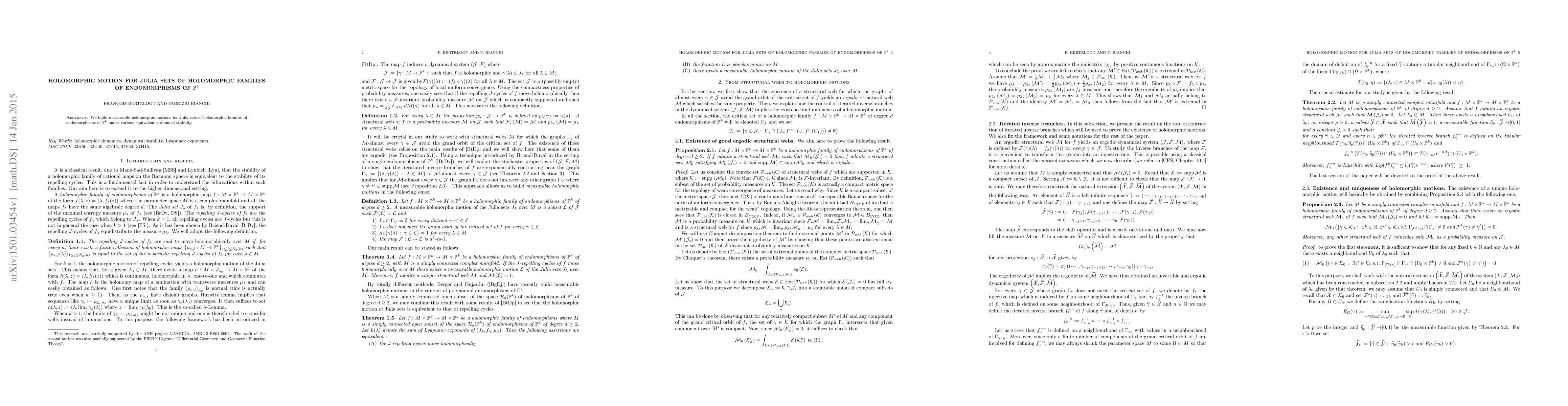 Summary: This paper constructs measurable holomorphic motions for the Julia sets of holomorphic families of endomorphisms in complex projective spaces, exploring stability under different equivalent notions.