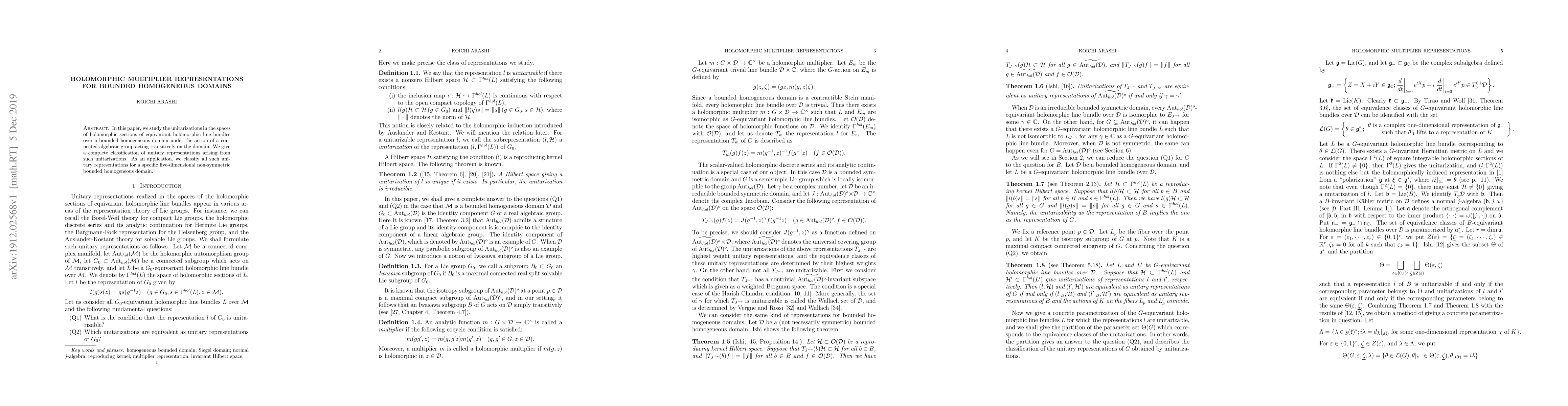 This paper classifies unitary representations arising from unitarizations of equivariant holomorphic line bundles over bounded homogeneous domains, providing a complete classification for a specific five-dimensional domain.