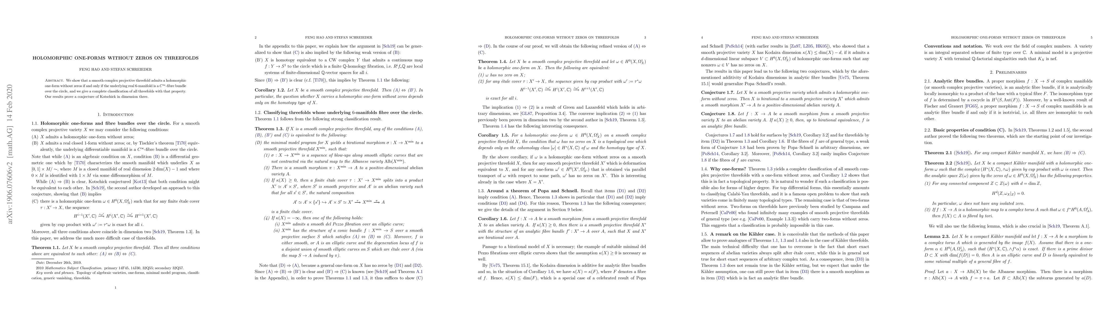 This paper proves that a smooth complex projective threefold has a holomorphic one-form without zeros if and only if it can be smoothly fibred over the circle, classifying such threefolds and confirming a conjecture by Kotschick in dimension three.