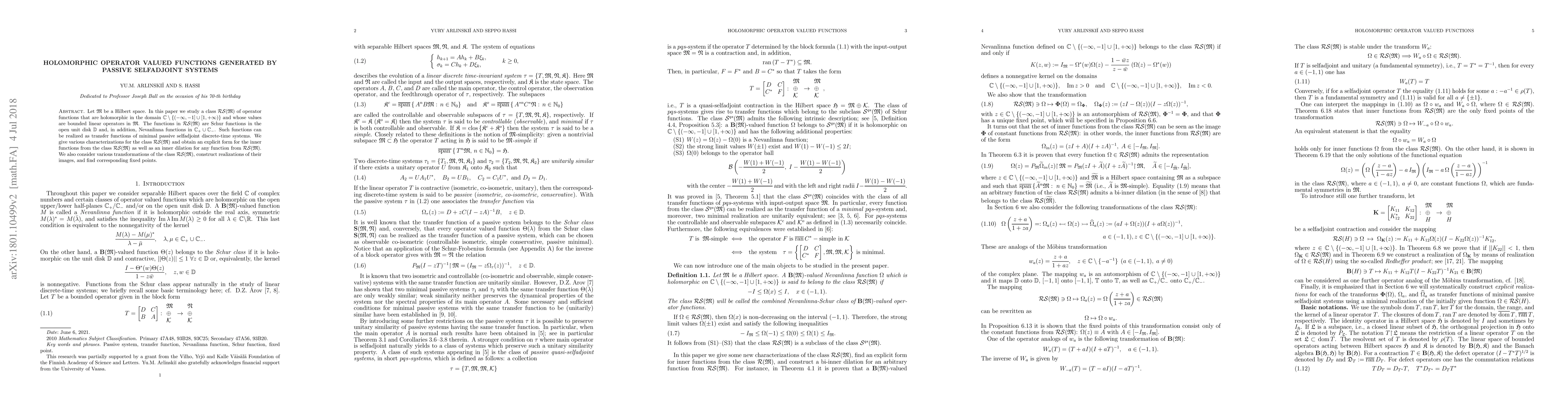 This paper explores holomorphic operator-valued functions $\mathcal R\mathcal S(\mathfrak M)$ that are contractive and arise from minimal passive selfadjoint discrete-time systems. It provides explicit characterizations and inner dilations for these functions and examines transformations and their realizations.