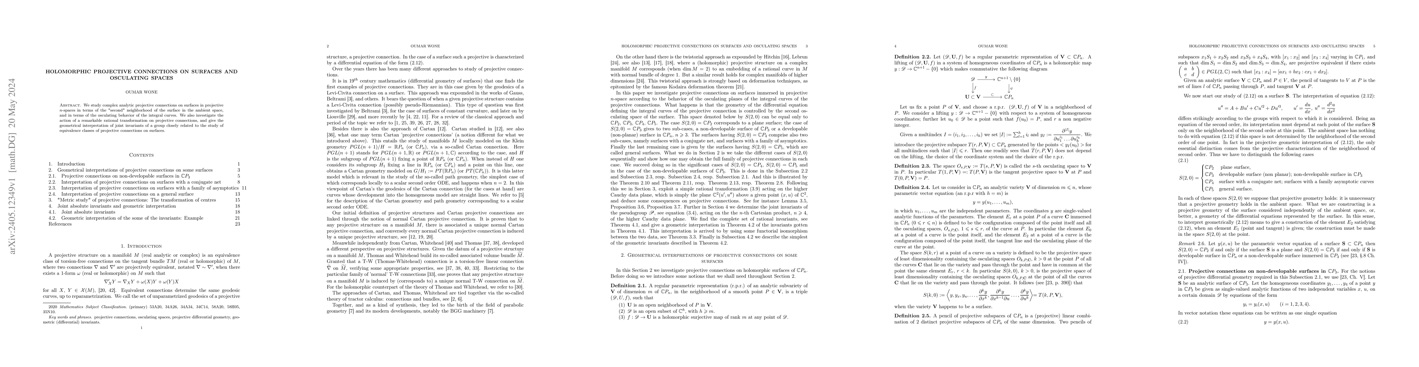 This paper examines complex projective connections on surfaces in projective n-spaces, focusing on their osculating behavior and the effects of a specific rational transformation. It also explores the geometrical implications of invariants related to equivalence classes of these connections.
