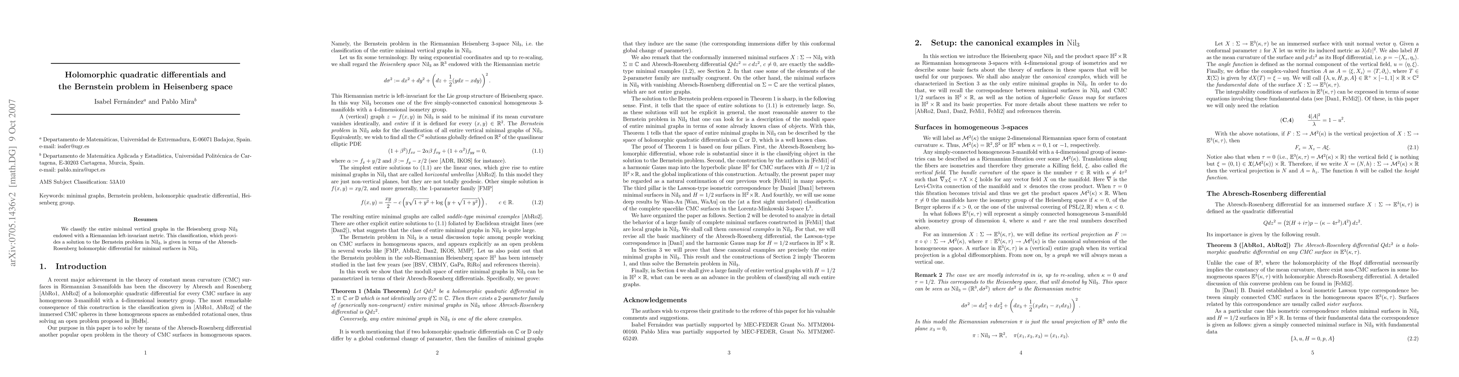 Summary: The paper classifies minimal vertical graphs in the 3-dimensional Heisenberg group, solving the Bernstein problem by using the Abresch-Rosenberg holomorphic differential for minimal surfaces in this setting.