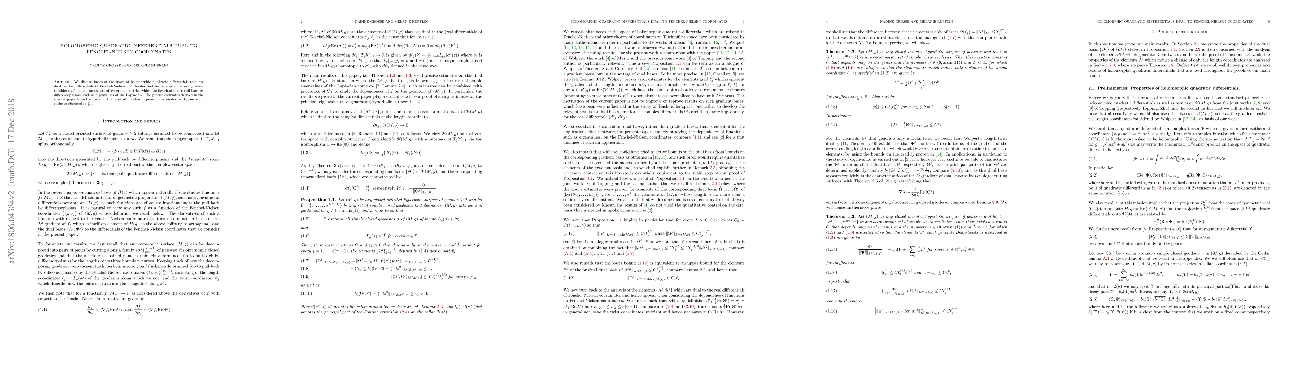 We discuss bases of the space of holomorphic quadratic differentials that are dual to the differentials of Fenchel-Nielsen coordinates and hence appear naturally when considering functions on the set of hyperbolic metrics which are invariant under pull-back by diffeomorphisms, such as eigenvalues of the Laplacian. The precise estimates derived in the current paper form the basis for the proof of the sharp eigenvalue estimates on degenerating surfaces obtained in arXiv:1701.08491.