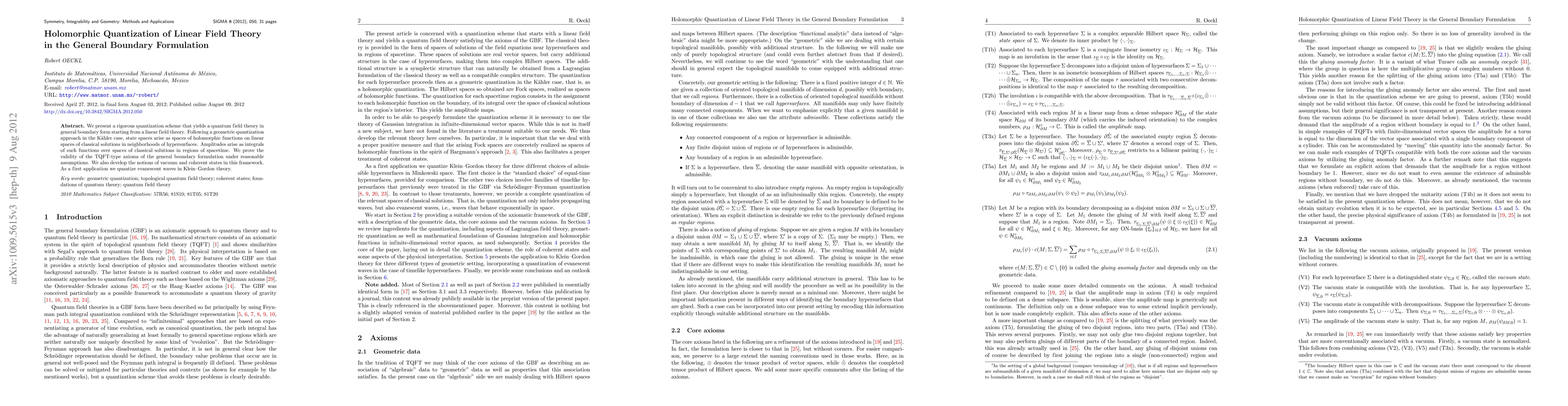 This paper presents a rigorous scheme for holomorphic quantization of linear field theory, leading to a quantum field theory with general boundary conditions. It establishes TQFT-type axioms and introduces vacuum and coherent states, with an application to quantizing evanescent waves in Klein-Gordon theory.