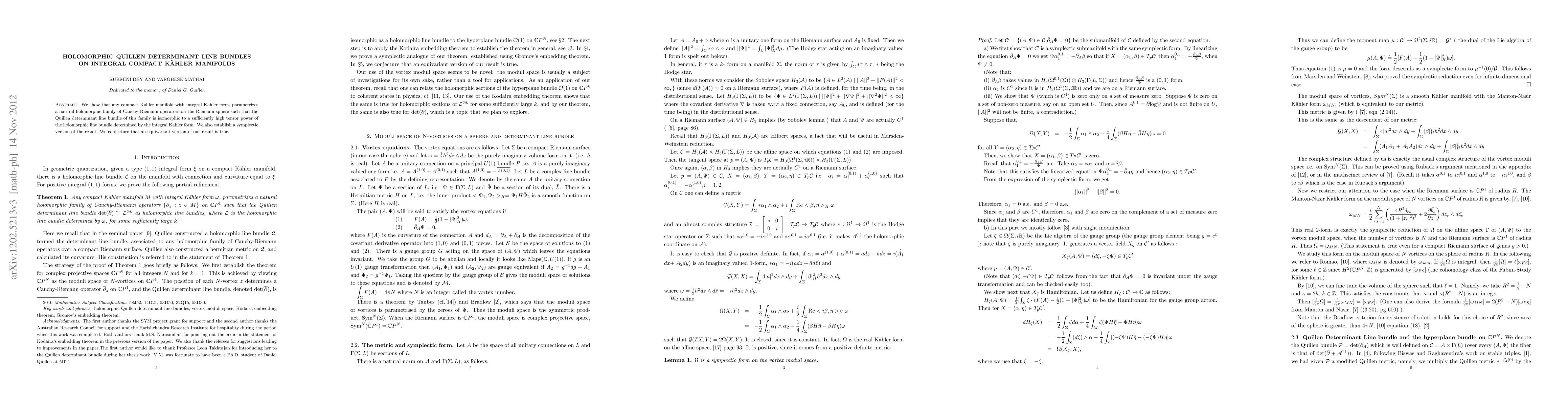 This paper demonstrates that compact Kahler manifolds with integral Kahler forms support a holomorphic family of Cauchy-Riemann operators on the Riemann sphere, where the Quillen determinant line bundle corresponds to a high tensor power of the line bundle from the integral Kahler form. A symplectic version of this result is also presented, with a conjecture for an equivariant extension.