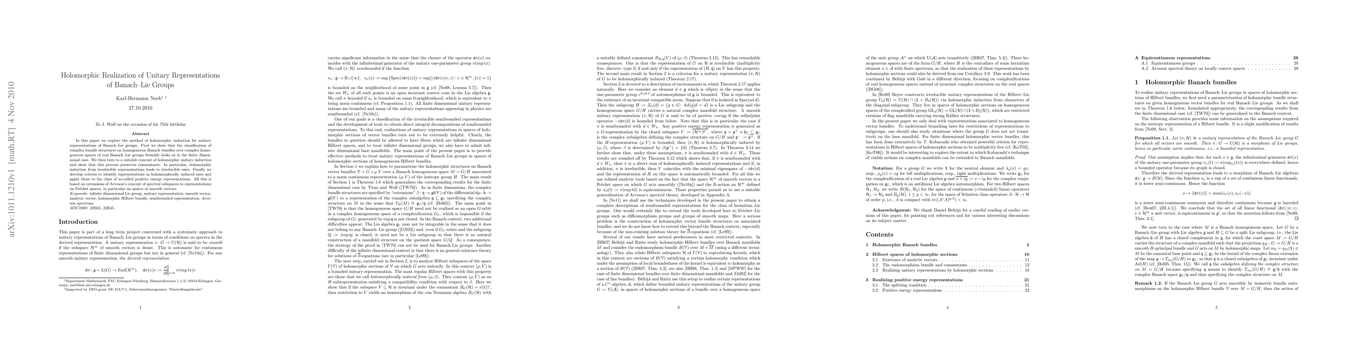 This paper investigates holomorphic induction for unitary representations of Banach-Lie groups, showing that this method preserves commutants and results in irreducible representations when applied to irreducible ones. It extends Arveson's spectral subspaces to Fr\'echet spaces and identifies holomorphically induced representations, particularly focusing on positive energy representations.