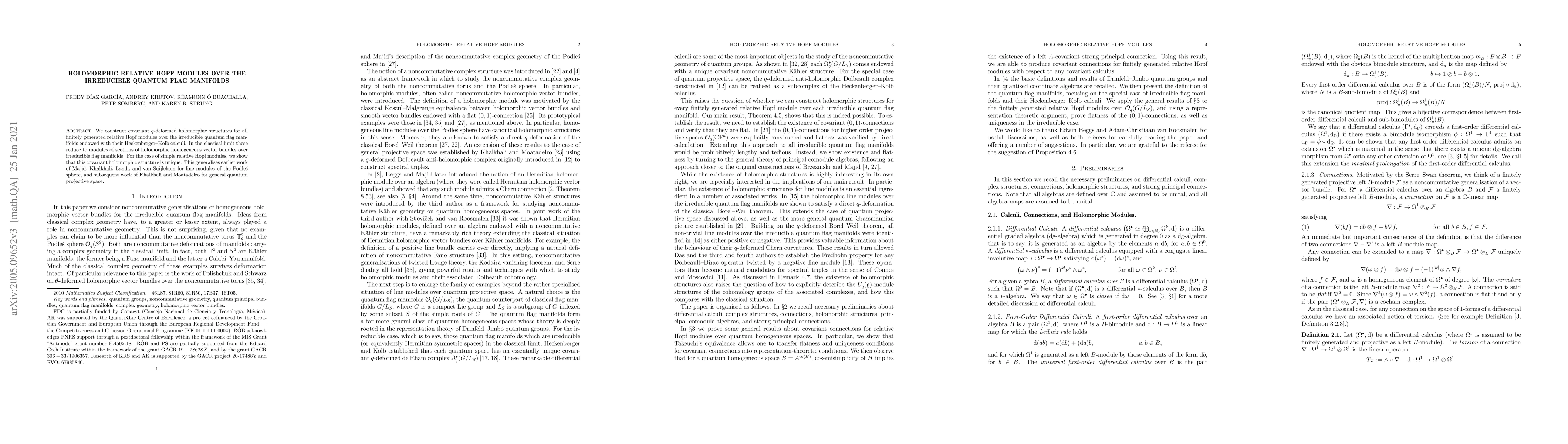 We construct covariant $q$-deformed holomorphic structures for all finitely-generated relative Hopf modules over the irreducible quantum flag manifolds endowed with their Heckenberger--Kolb calculi. In the classical limit these reduce to modules of sections of holomorphic homogeneous vector bundles over irreducible flag manifolds. For the case of simple relative Hopf modules, we show that this covariant holomorphic structure is unique. This generalises earlier work of Majid, Khalkhali, Landi, and van Suijlekom for line modules of the Podle\'s sphere, and subsequent work of Khalkhali and Moatadelro for general quantum projective space.