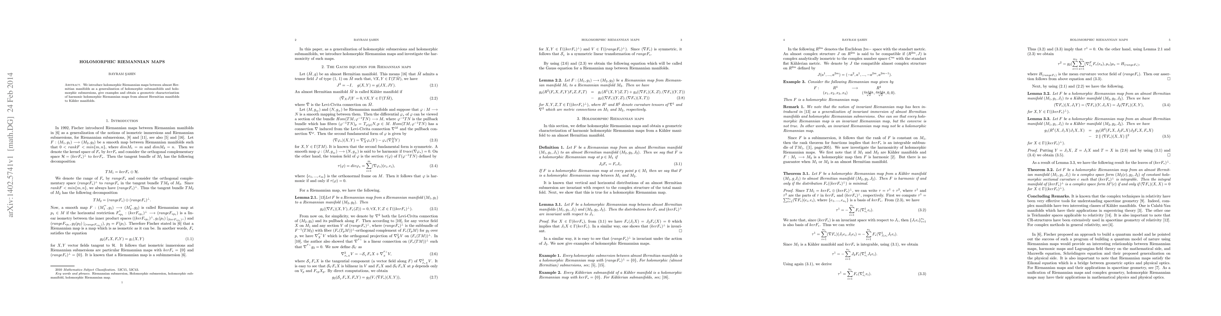 This paper defines holomorphic Riemannian maps between almost Hermitian manifolds, generalizing holomorphic submanifolds and submersions, and characterizes harmonic instances of these maps to Kähler manifolds. Examples are provided to illustrate the new concept.