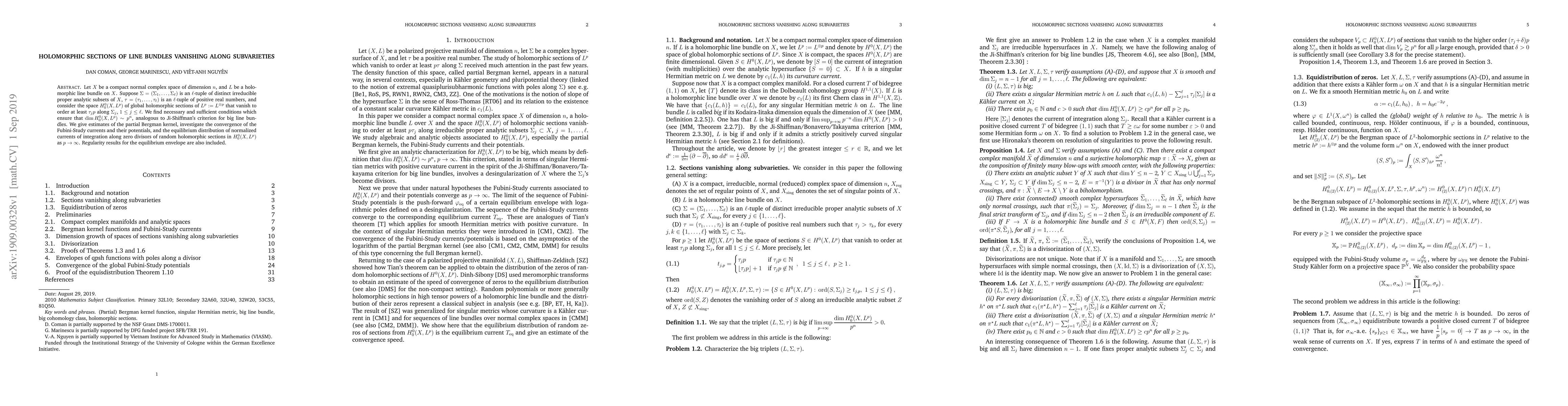 This paper studies holomorphic sections of a line bundle $L^p$ on a compact normal complex space $X$ that vanish along specified subvarieties $\Sigma_j$, providing conditions for the dimension of $H^0_0(X, L^p)$ to be $p^n$. It also explores the convergence of Fubini-Study currents and the equilibrium distribution of normalized integration currents as $p$ tends to infinity.
