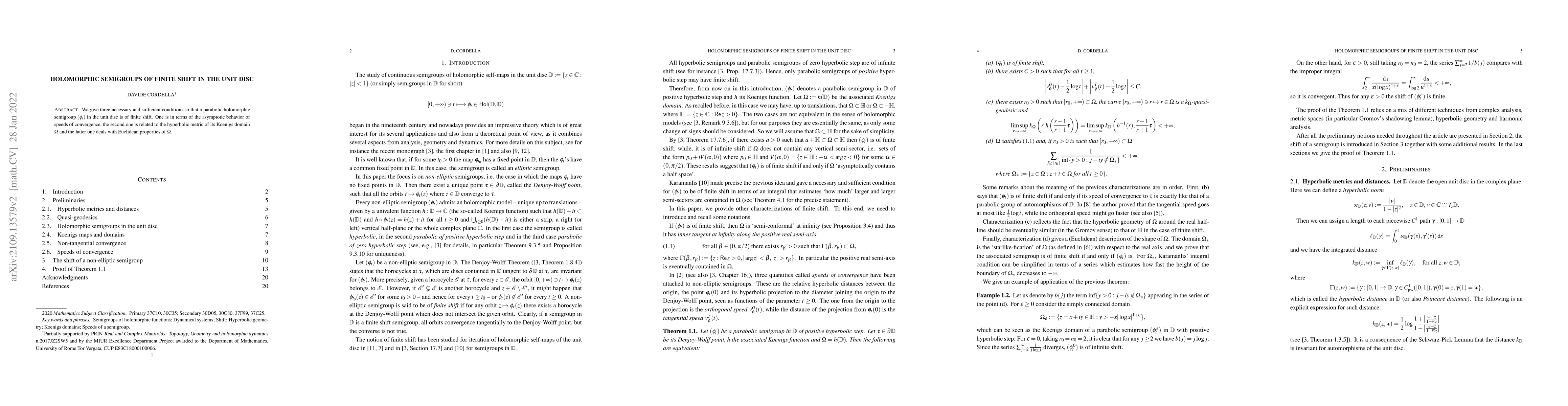 This paper establishes three necessary and sufficient conditions for a parabolic holomorphic semigroup in the unit disc to have finite shift. These conditions involve the convergence speeds, the hyperbolic metric of its Koenigs domain, and Euclidean properties of the domain.