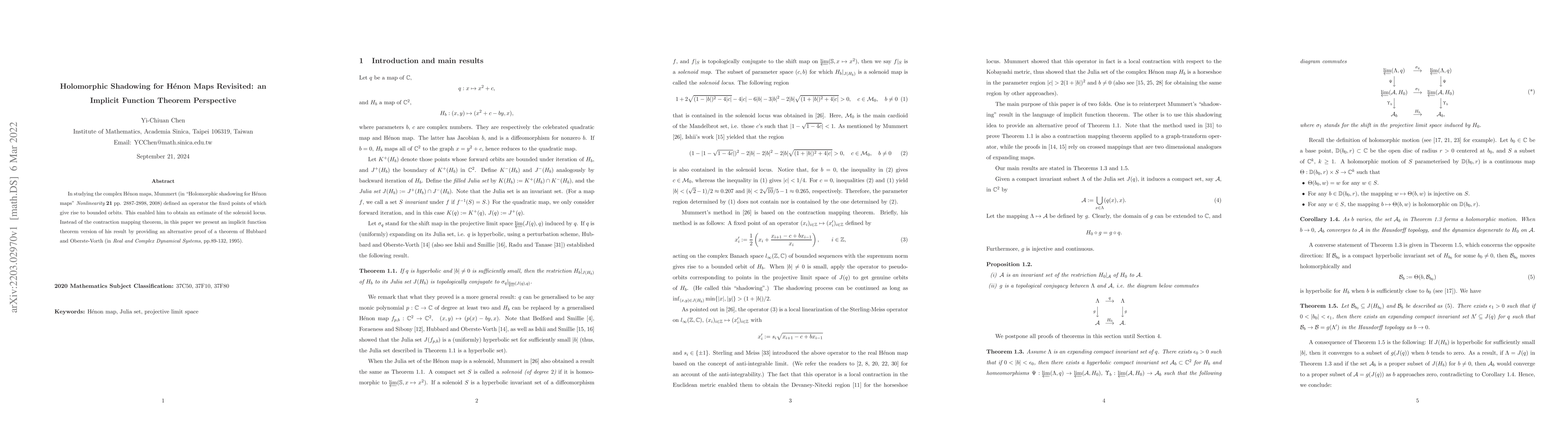 In studying the complex H\'enon maps, Mummert (in "Holomorphic shadowing for H\'enon maps" Nonlinearity 21 pp. 2887-2898, 2008) defined an operator the fixed points of which give rise to bounded orbits. This enabled him to obtain an estimate of the solenoid locus. Instead of the contraction mapping theorem, in this paper we present an implicit function theorem version of his result by providing an alternative proof of a theorem of Hubbard and Oberste-Vorth (in Real and Complex Dynamical Systems, pp.89-132, 1995).