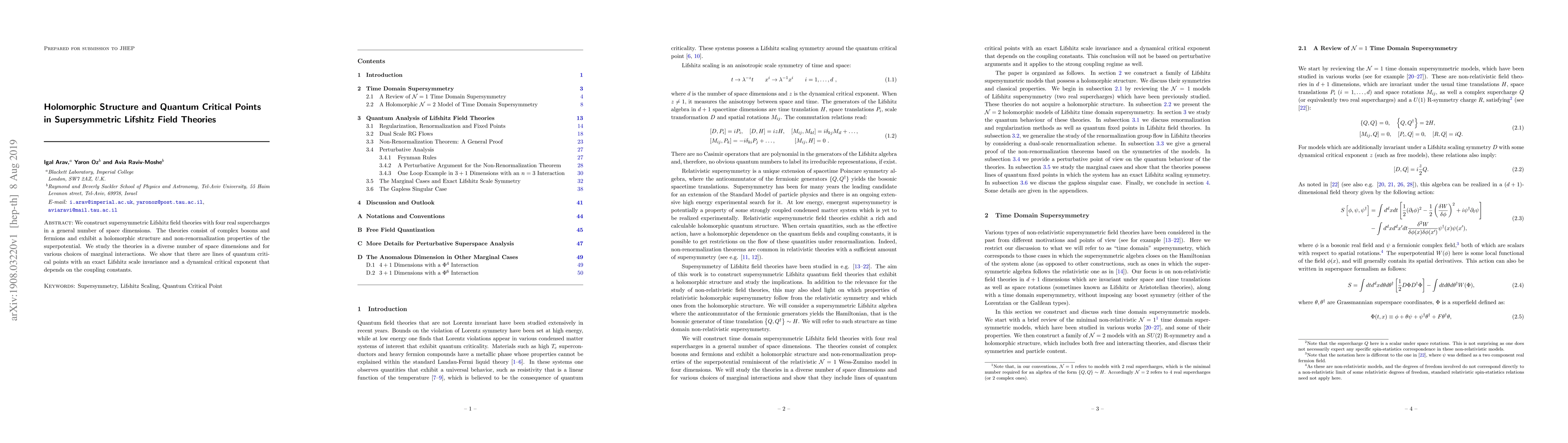 This paper constructs supersymmetric Lifshitz field theories with four real supercharges, demonstrating their holomorphic structure and non-renormalization properties. It identifies lines of quantum critical points with exact Lifshitz scale invariance and a dynamical critical exponent dependent on coupling constants.