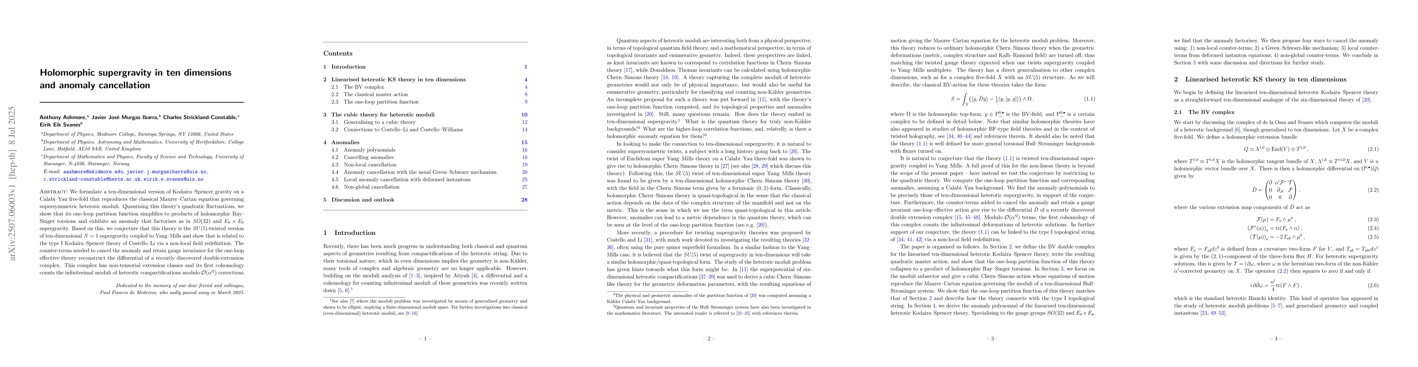 We formulate a ten-dimensional version of Kodaira-Spencer gravity on a Calabi-Yau five-fold that reproduces the classical Maurer-Cartan equation governing supersymmetric heterotic moduli. Quantising this theory's quadratic fluctuations, we show that its one-loop partition function simplifies to products of holomorphic Ray-Singer torsions and exhibits an anomaly that factorises as in $SO(32)$ and $E_8\times E_8$ supergravity. Based on this, we conjecture that this theory is the $SU(5)$-twisted version of ten-dimensional $N=1$ supergravity coupled to Yang-Mills and show that is related to the type I Kodaira-Spencer theory of Costello-Li via a non-local field redefinition. The counter-terms needed to cancel the anomaly and retain gauge invariance for the one-loop effective theory reconstruct the differential of a recently discovered double-extension complex. This complex has non-tensorial extension classes and its first cohomology counts the infinitesimal moduli of heterotic compactifications modulo order $\alpha'^2$ corrections.