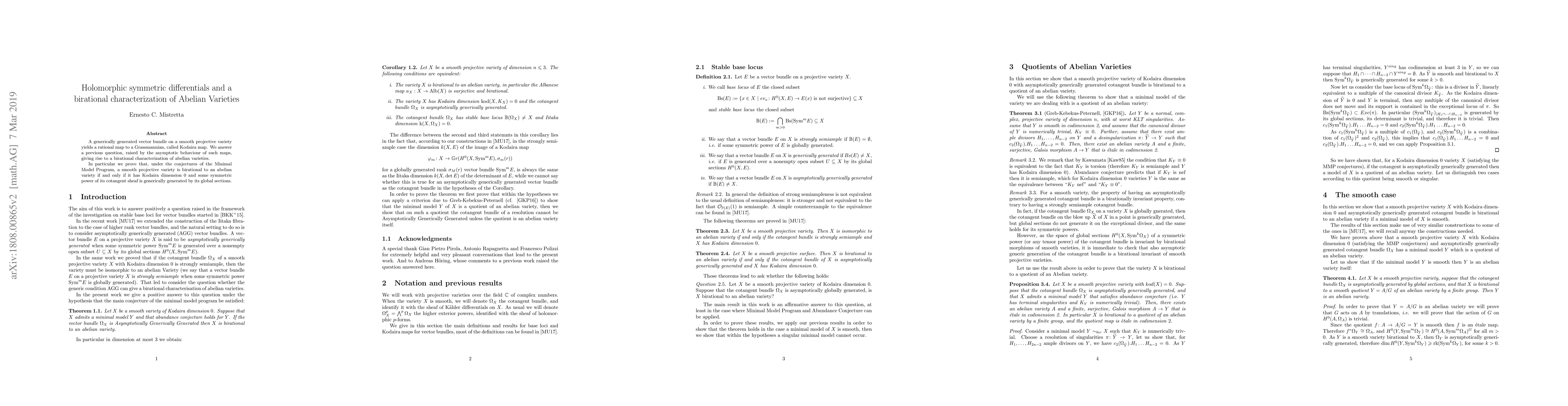 This paper provides a birational characterization of abelian varieties using holomorphic symmetric differentials. It proves that a smooth projective variety is birational to an abelian variety if it has Kodaira dimension 0 and a symmetric power of its cotangent sheaf is generically generated by global sections, under the conjectures of the Minimal Model Program.