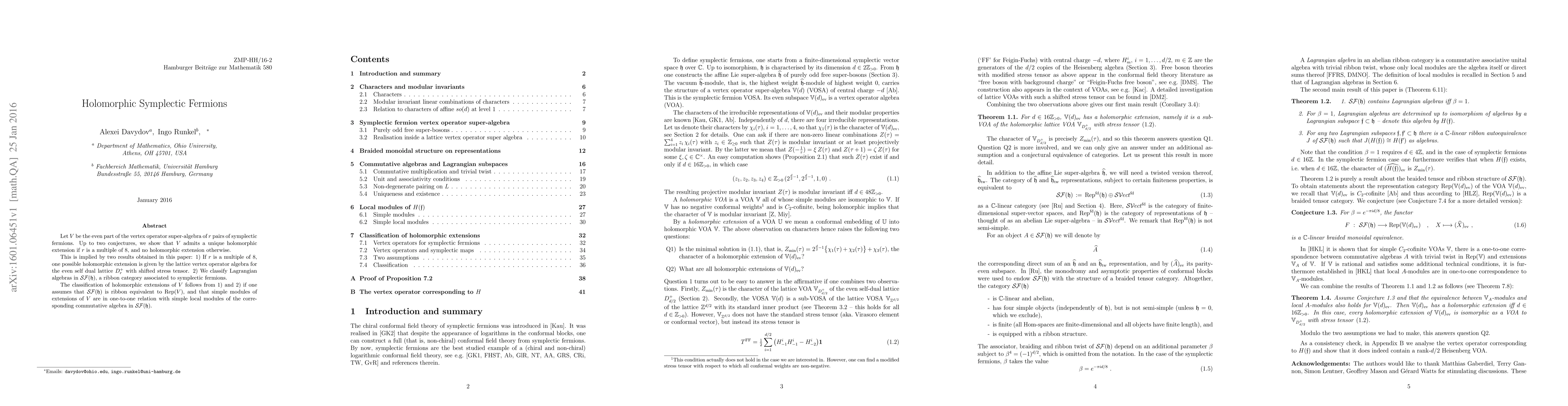 Let V be the even part of the vertex operator super-algebra of r pairs of symplectic fermions. Up to two conjectures, we show that V admits a unique holomorphic extension if r is a multiple of 8, and no holomorphic extension otherwise. This is implied by two results obtained in this paper: 1) If r is a multiple of 8, one possible holomorphic extension is given by the lattice vertex operator algebra for the even self dual lattice $D_r^+$ with shifted stress tensor. 2) We classify Lagrangian algebras in SF(h), a ribbon category associated to symplectic fermions. The classification of holomorphic extensions of V follows from 1) and 2) if one assumes that SF(h) is ribbon equivalent to Rep(V), and that simple modules of extensions of V are in one-to-one relation with simple local modules of the corresponding commutative algebra in SF(h).