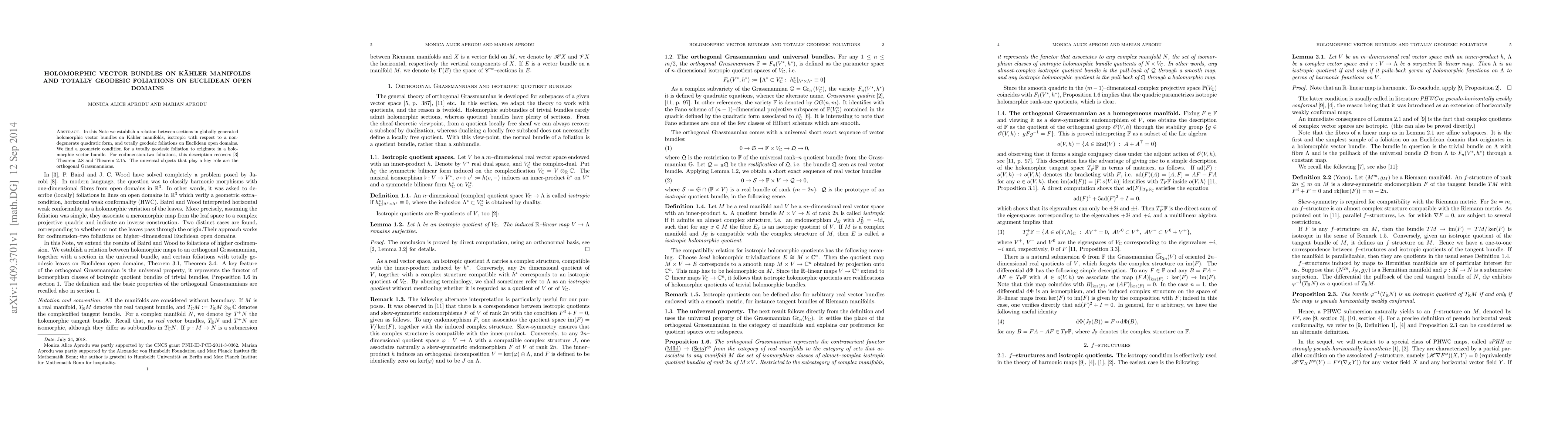 This paper establishes a connection between sections of globally generated holomorphic vector bundles on Kähler manifolds, which are isotropic with respect to a non-degenerate quadratic form, and totally geodesic foliations on Euclidean open domains. It identifies a geometric condition for such foliations to originate from these vector bundles, with specific recovery of Baird and Wood’s results for codimension-two foliations.