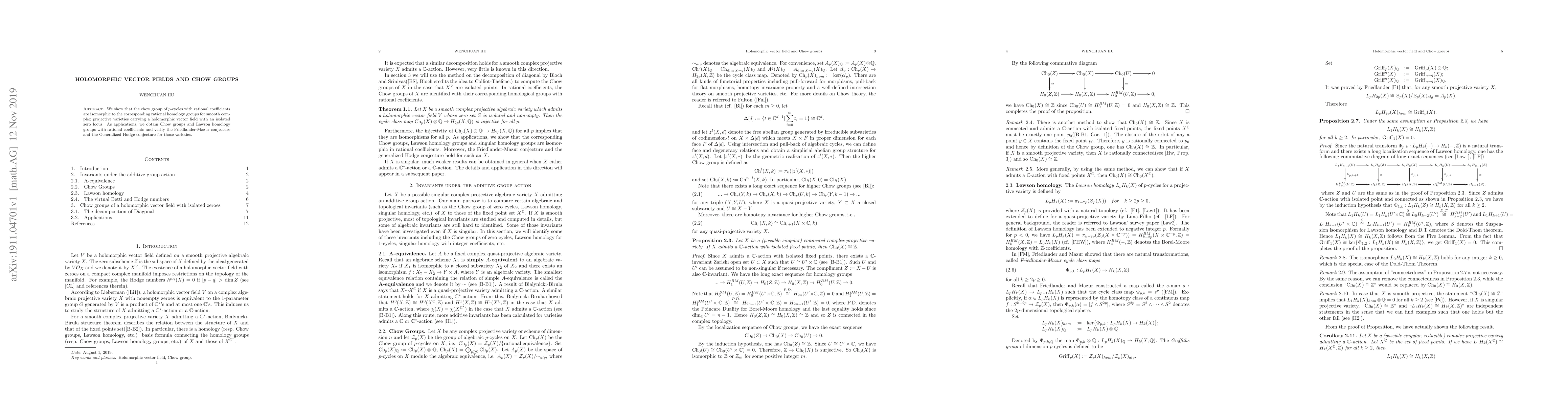 This paper demonstrates an isomorphism between Chow groups and rational homology groups for smooth complex projective varieties with holomorphic vector fields having isolated zero loci. It also verifies the Friedlander-Mazur conjecture and the Generalized Hodge conjecture for these varieties.