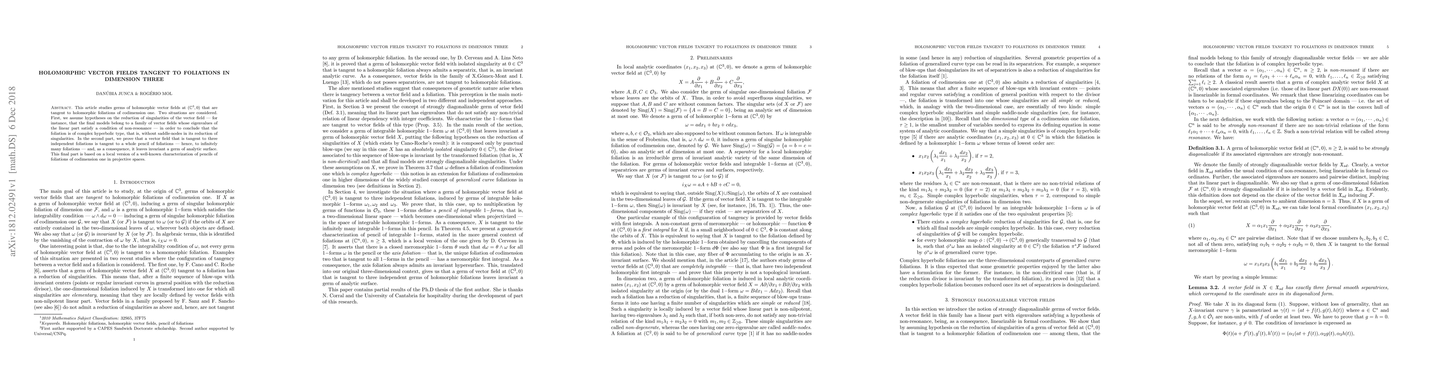 This paper investigates holomorphic vector fields in C³ that are tangent to codimension one foliations, proving that under certain non-resonance conditions, the foliation is complex hyperbolic. It also demonstrates that a vector field tangent to three independent foliations is tangent to infinitely many, thereby invariantly leaving a germ of an analytic surface.