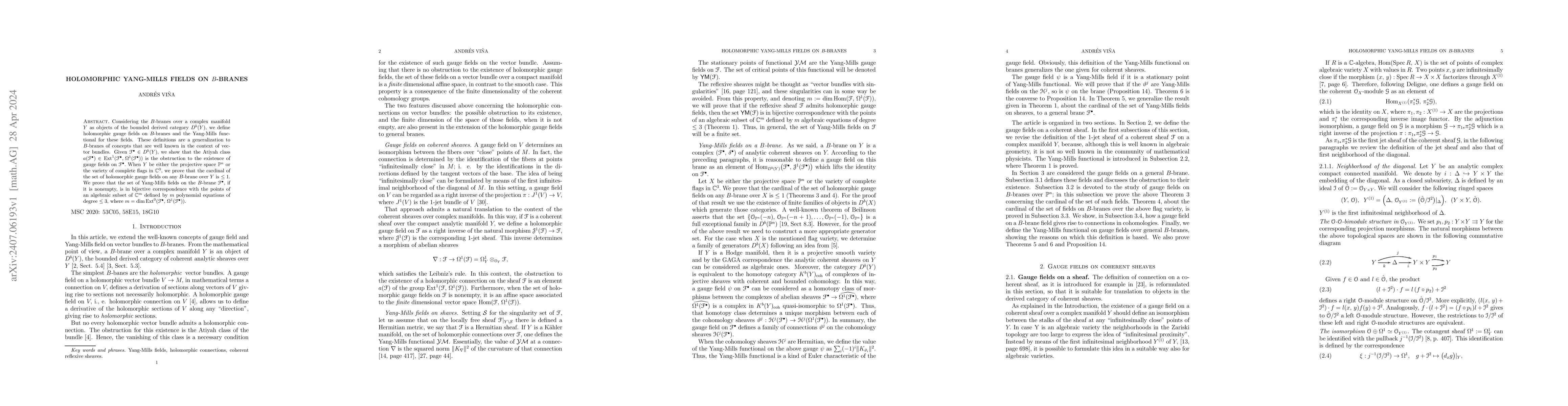 This paper defines holomorphic gauge fields on $B$-branes in the context of complex manifolds and extends the Yang-Mills functional to these objects. It shows that the Atiyah class obstructs the existence of gauge fields, and for specific manifolds, proves the set of holomorphic gauge fields on $B$-branes is finite and corresponds to solutions of polynomial equations.