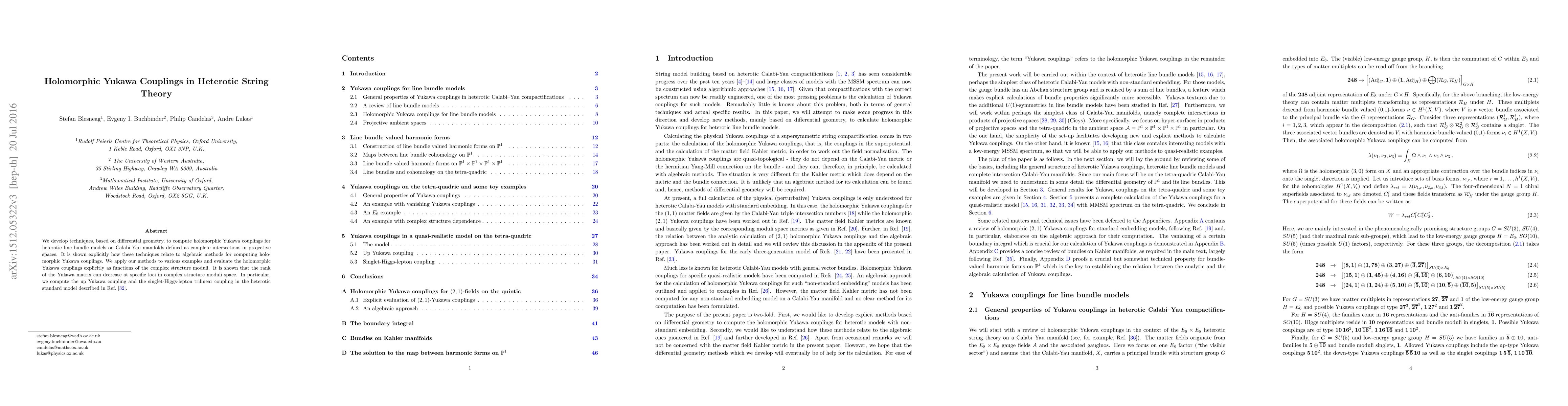 This paper develops differential geometry techniques to compute holomorphic Yukawa couplings in heterotic string theory, applying them to line bundle models on Calabi-Yau manifolds. The study reveals a decrease in the rank of the Yukawa matrix at specific complex structure moduli, with explicit computations of key couplings.