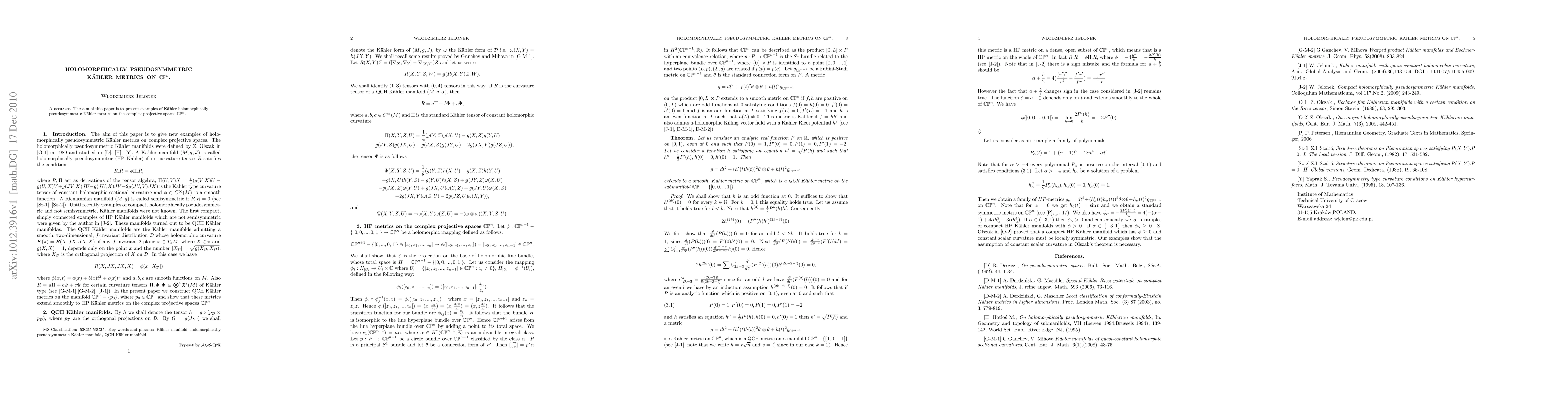 Summary: This paper provides examples of Kahler metrics on the complex projective space CP^n that exhibit holomorphic pseudosymmetry, exploring their geometric properties and implications.