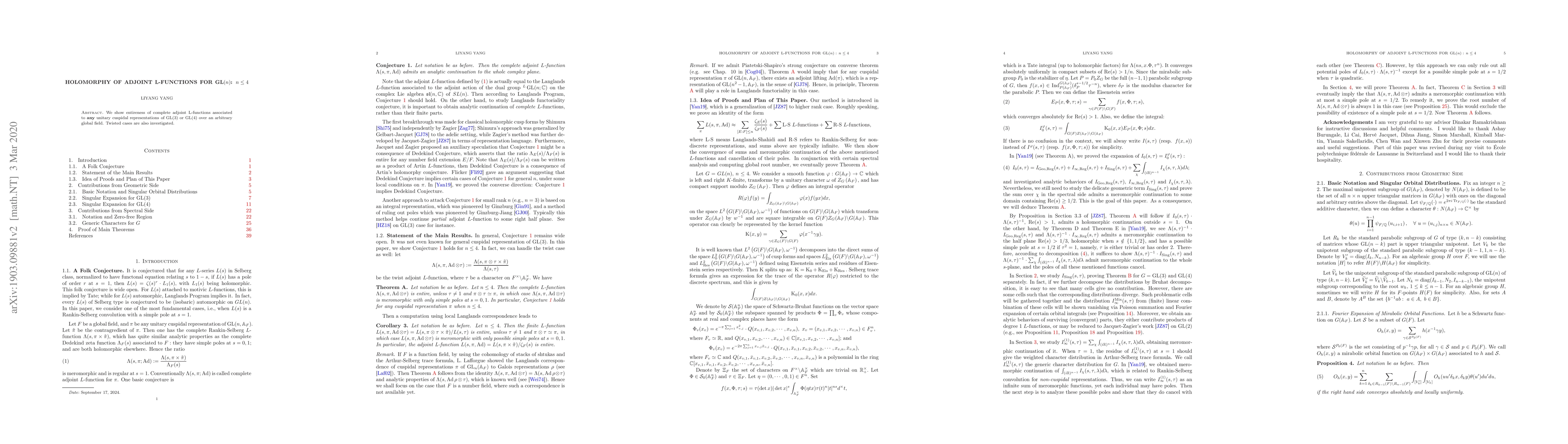 This paper proves that adjoint L-functions for GL(3) and GL(4) over any global field are entire functions, meaning they have no singularities except at infinity. The study also covers twisted cases.