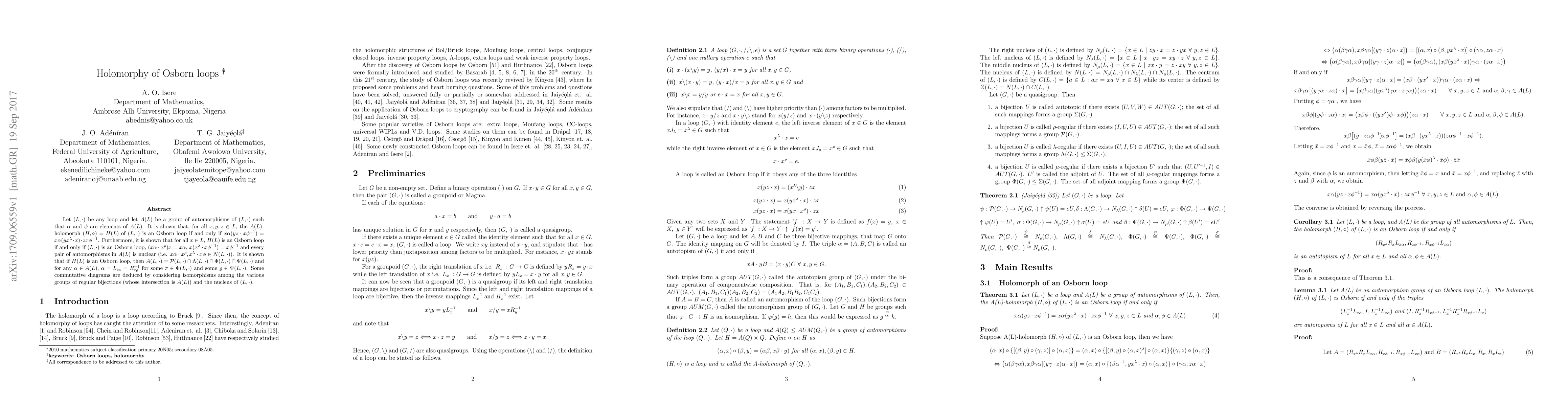 This paper studies the holomorphy of Osborn loops and finds that a loop is an Osborn loop if certain conditions on its automorphisms are met, including being nuclear and satisfying specific equations involving the automorphisms.