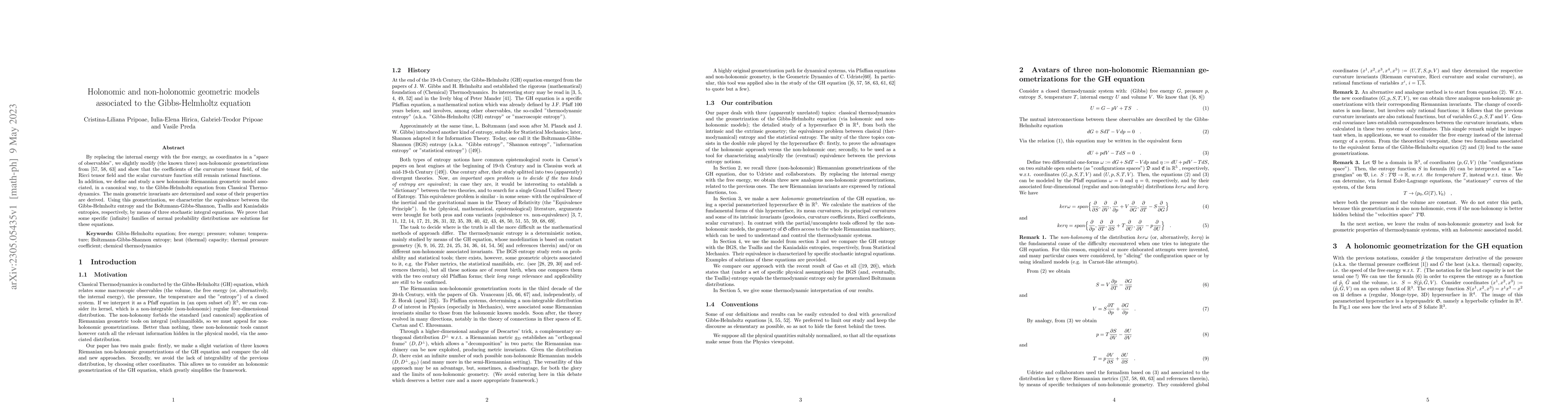 This paper modifies existing non-holonomic geometric models by using free energy instead of internal energy, introducing a new holonomic Riemannian model for the Gibbs-Helmholtz equation. It determines geometric invariants and uses the geometrization to characterize equivalences between different entropy formulations through stochastic integral equations, proving certain probability distributions as solutions.