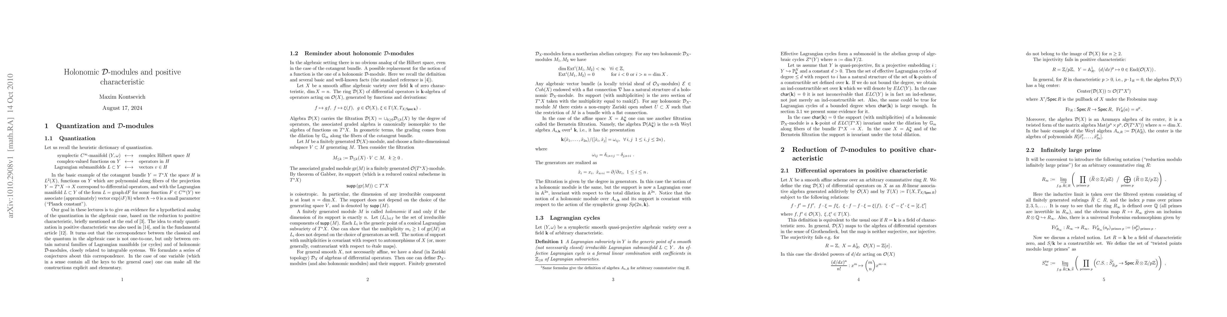 Summary: This paper explores a potential link between holonomic D-modules on algebraic varieties in characteristic zero and Lagrangian subvarieties in their cotangent bundles, leveraging reductions to positive characteristic to establish this correspondence.
