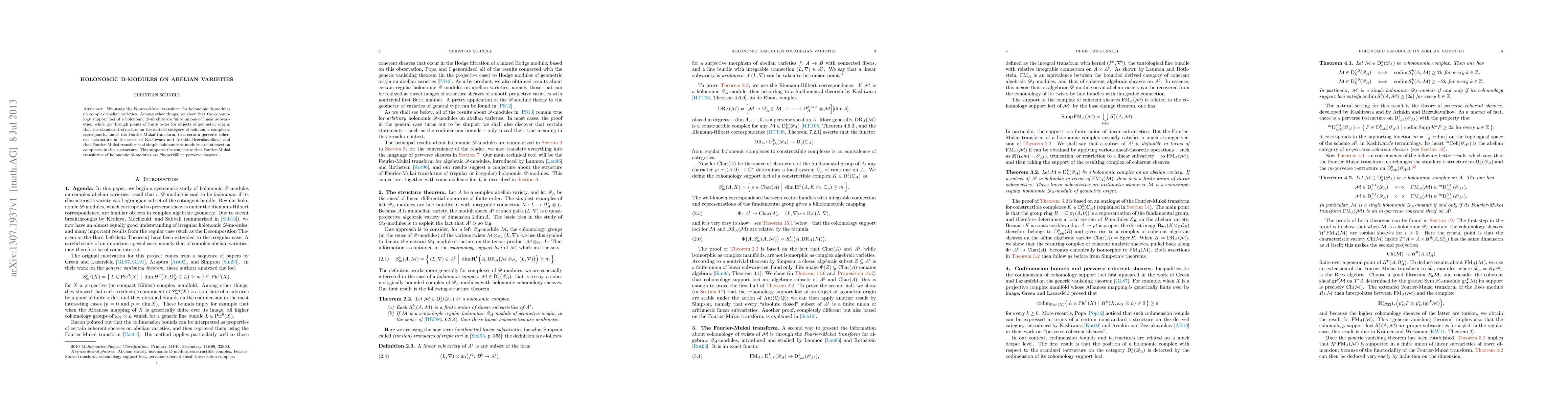 This paper investigates the Fourier-Mukai transform for holonomic D-modules on abelian varieties, demonstrating that their cohomology support loci are finite unions of linear subvarieties. It also links the standard t-structure on holonomic complexes to a perverse coherent t-structure under the Fourier-Mukai transform, supporting the conjecture of "hyperkähler perverse sheaves".