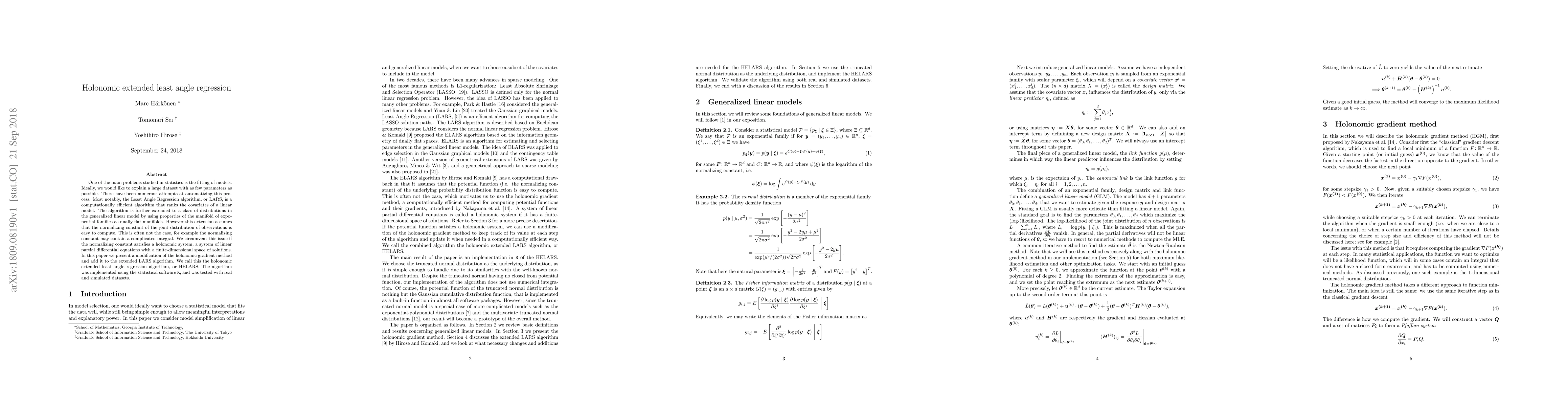 One of the main problems studied in statistics is the fitting of models. Ideally, we would like to explain a large dataset with as few parameters as possible. There have been numerous attempts at automatizing this process. Most notably, the Least Angle Regression algorithm, or LARS, is a computationally efficient algorithm that ranks the covariates of a linear model. The algorithm is further extended to a class of distributions in the generalized linear model by using properties of the manifold of exponential families as dually flat manifolds. However this extension assumes that the normalizing constant of the joint distribution of observations is easy to compute. This is often not the case, for example the normalizing constant may contain a complicated integral. We circumvent this issue if the normalizing constant satisfies a holonomic system, a system of linear partial differential equations with a finite-dimensional space of solutions. In this paper we present a modification of the holonomic gradient method and add it to the extended LARS algorithm. We call this the holonomic extended least angle regression algorithm, or HELARS. The algorithm was implemented using the statistical software R, and was tested with real and simulated datasets.