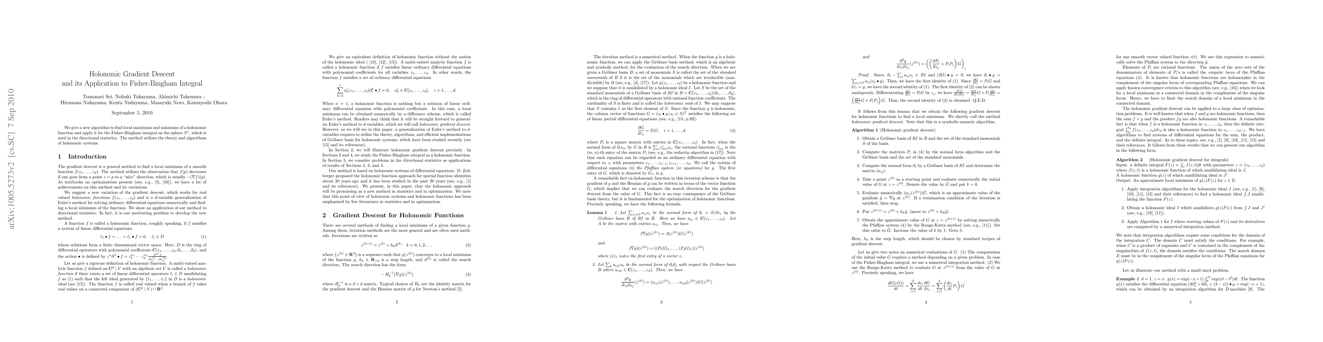 Summary: This paper introduces a novel holonomic gradient descent algorithm for finding local extrema of holonomic functions and applies it to compute the Fisher-Bingham integral on the sphere, a key tool in directional statistics. The method leverages advanced holonomic systems theory and algorithms.