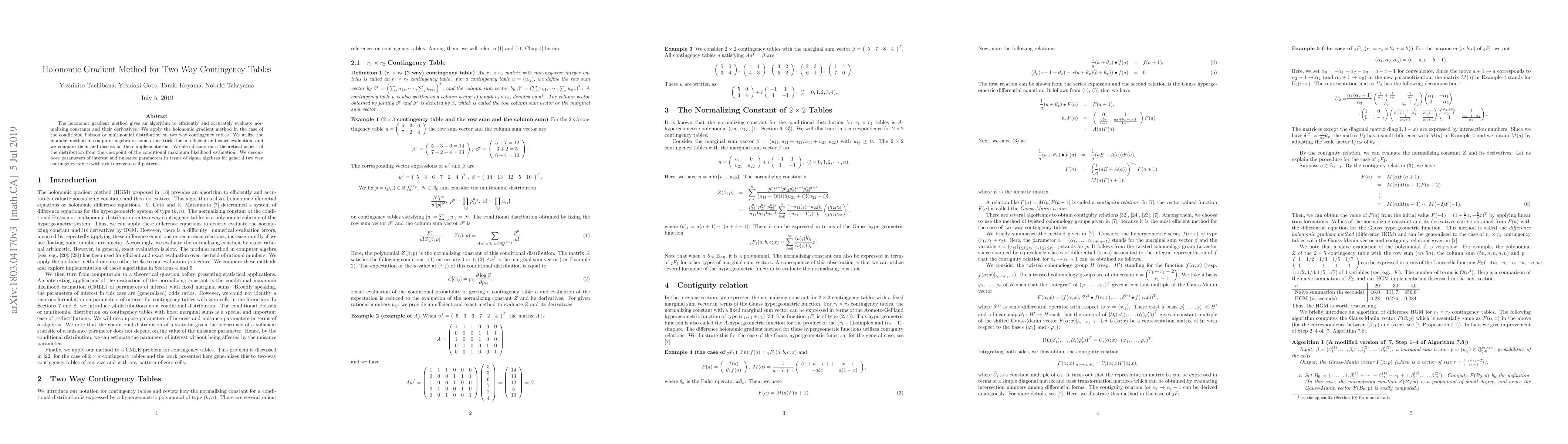 The holonomic gradient method is applied to evaluate normalizing constants and their derivatives for conditional Poisson or multinomial distributions in two-way contingency tables, utilizing modular methods in computer algebra for efficient computation. The paper also discusses the complexities of these algorithms and their theoretical implications from the perspective of conditional maximum likelihood estimation.