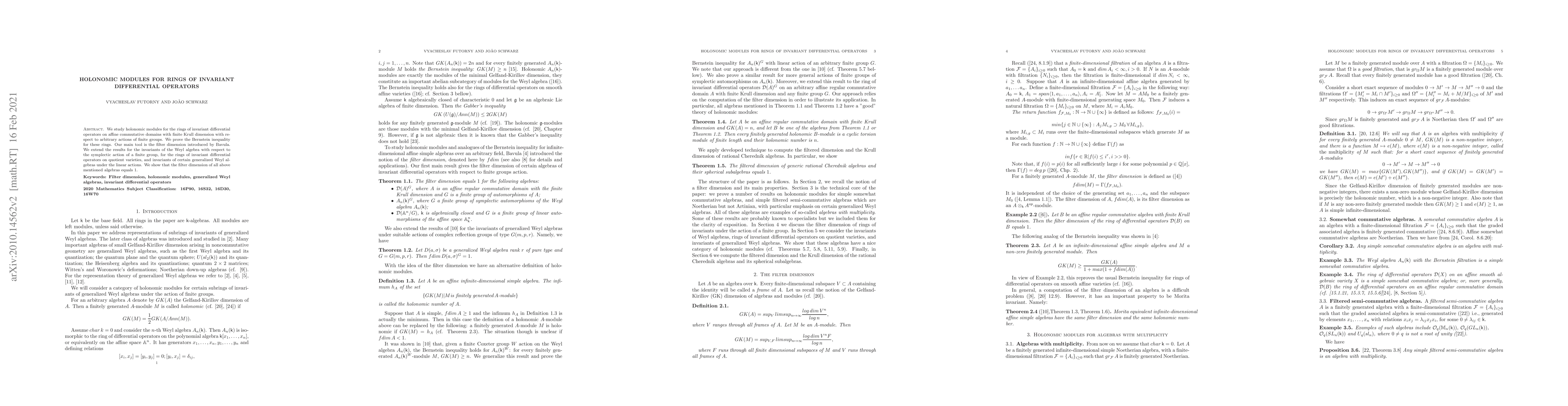 This paper investigates holonomic modules for rings of invariant differential operators on affine domains under finite group actions, proving the Bernstein inequality. It extends results to Weyl algebra invariants, quotient varieties, and generalized Weyl algebras, showing their filter dimension equals 1.