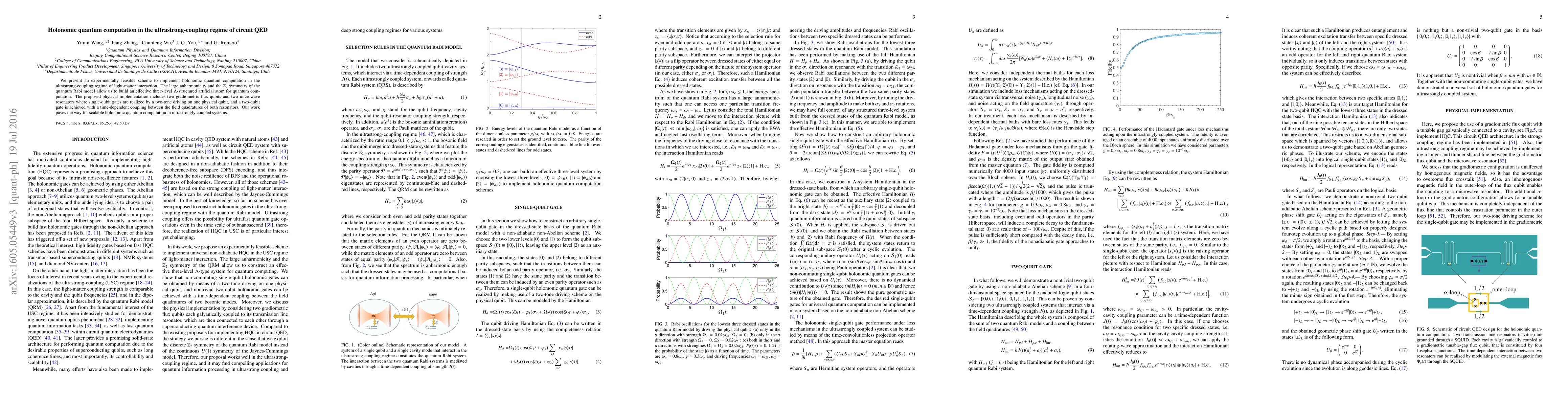 This research proposes a practical scheme for holonomic quantum computation utilizing the ultrastrong-coupling regime in circuit QED, leveraging the quantum Rabi model's properties for effective three-level operations, and demonstrating scalable potential through gradiometric flux qubits and microwave resonators.