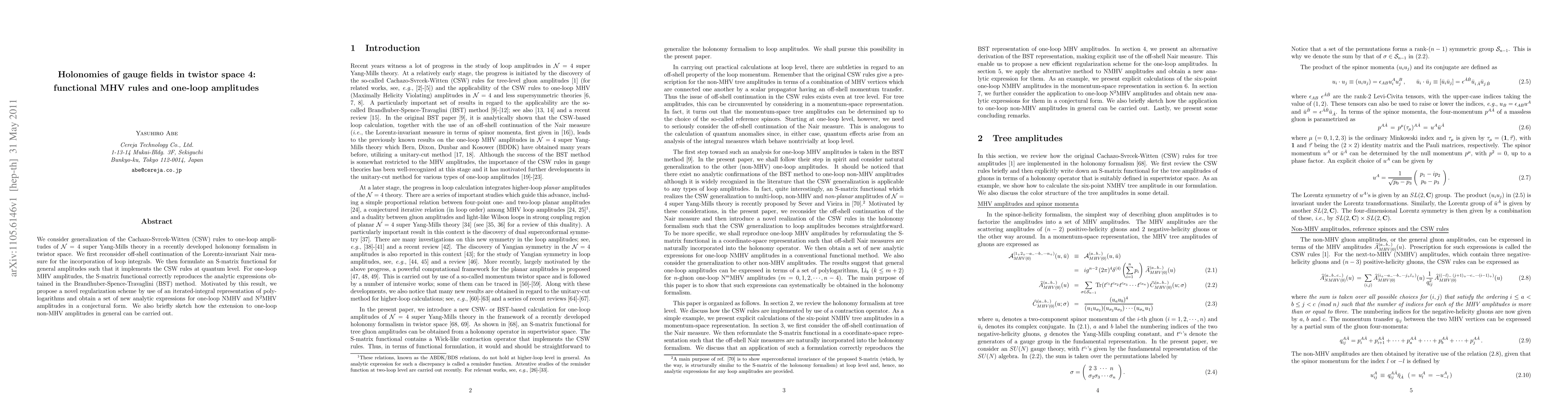 This paper extends the Cachazo-Svrcek-Witten (CSW) rules to one-loop amplitudes in N=4 super Yang-Mills theory using a twistor space holoonomy formalism. It introduces a novel regularization scheme based on iterated integrals to derive new conjectured expressions for one-loop NMHV and N²MHV amplitudes.