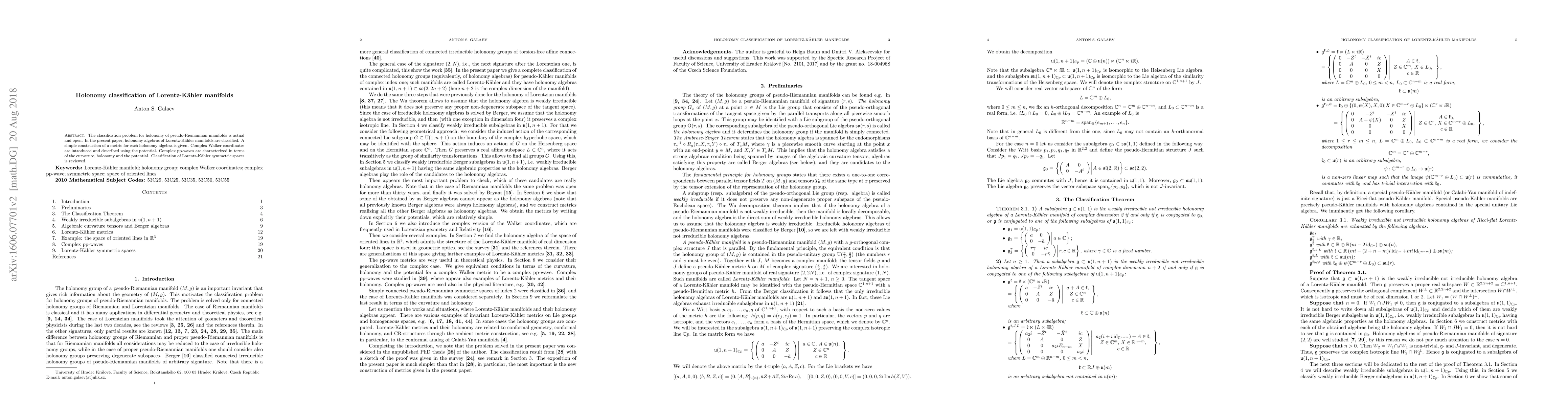 This paper classifies the holonomy algebras of Lorentz-Kähler manifolds, providing a metric construction for each algebra and introducing complex Walker coordinates. It also characterizes complex pp-waves and reviews the classification of Lorentz-Kähler symmetric spaces.