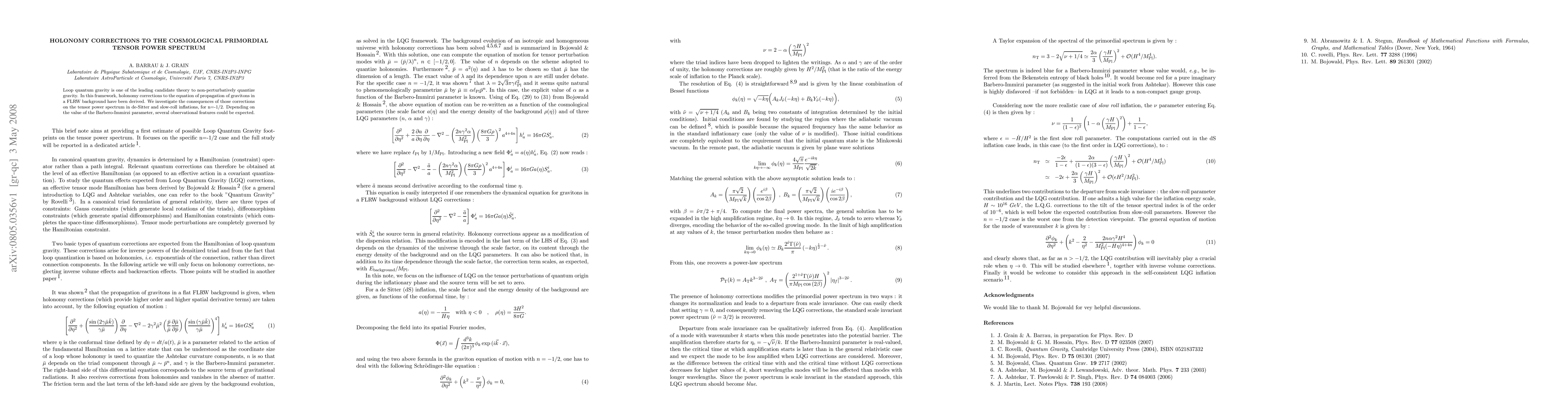This paper explores how holonomy corrections from loop quantum gravity affect the tensor power spectrum during de-Sitter and slow-roll inflation, finding that the resulting observational features depend on the Barbero-Immirzi parameter. These corrections modify the propagation of gravitons in a FLRW background.