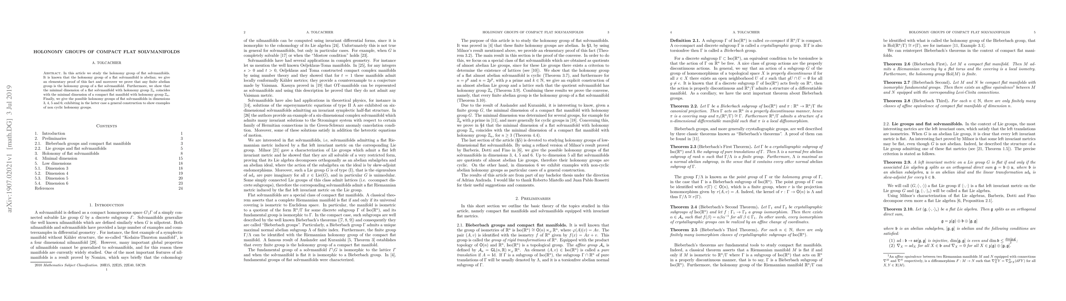 This paper proves that the holonomy group of a flat solvmanifold is abelian and shows that any finite abelian group can serve as such a holonomy group. It also establishes the equivalence between the minimal dimensions of flat solvmanifolds and compact flat manifolds for holonomy groups of $\mathbb{Z}_n$.
